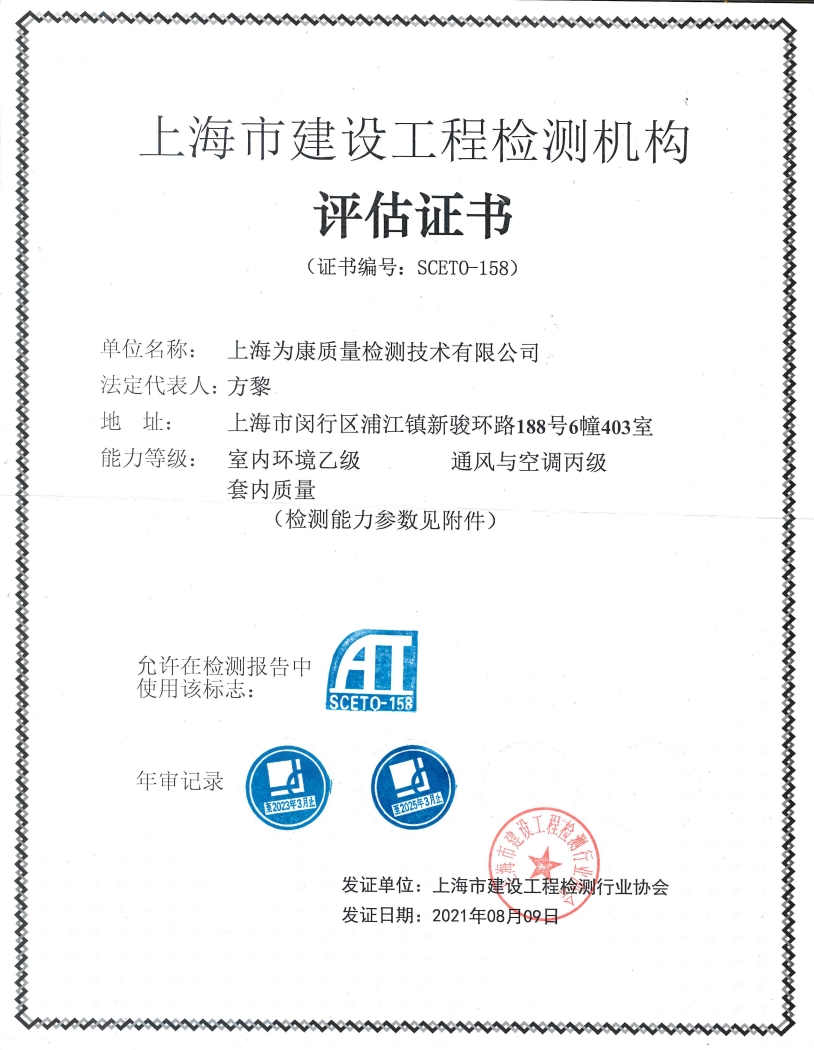 上海为康质量检测技术有限公司是上海市较早开展室内空气检测服务机构之一。